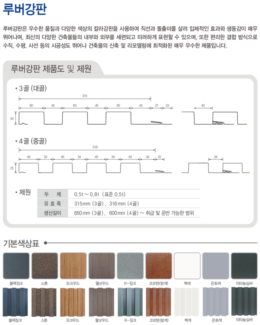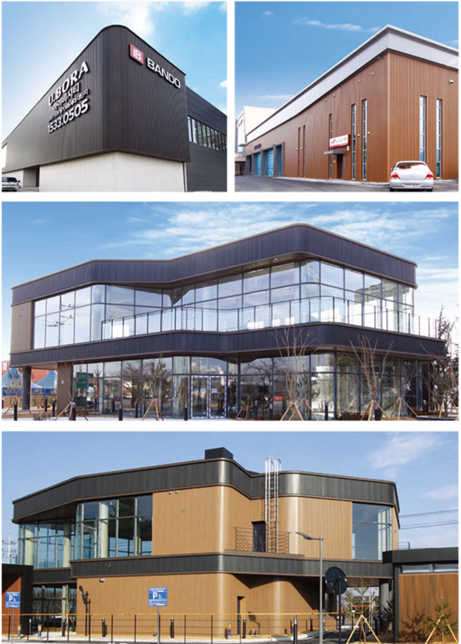 일정한 간격을 입체적으로 파형을 표현한 제품으로써 어두운 계열의 제품은 중후한 건물의 외관을 연출하며 우드계열의 프린트강판으로 생산되는 제품은 따뜻한 느낌으로 고급스러운 건물 외관을 연출할 수 있습니다. |
